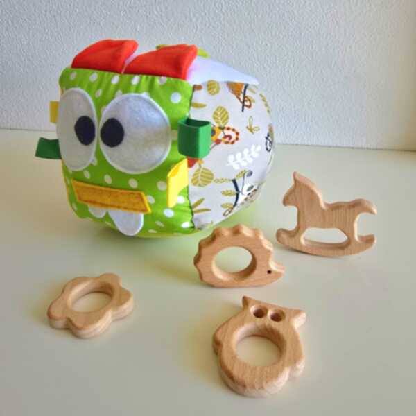 In dotazione anche un sonaglino interno al cubotto ed un legnetto per la dentizione in legno di faggio (scelto da me in base alla texture della stoffa)
